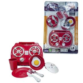 O kit vem com fogão cooktop com kit de jantarzinho, mercadinho com frutinhas e legumes, liquidificador e panelinha de pressão, batedeira, panelinha de pressão