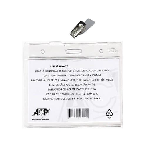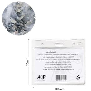 - Marca: ACP - Referência: C-7 - Cor: Cristal - 100 unidades crachá - 100 unidades Presilha Jacaré - Transparente - Crachá Horizontal - Abertura Vertical - Tamanho: 70 mm x 100 mm - Composição: PVC e Metal Ean: 27897027240741
