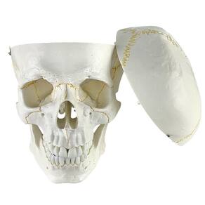 Modelo anatômico do crânio, em tamanho natural, desmontável em até 2 partes, evidencia estrutura interna, fissuras cranianas, base do crânio, arcada dentária e mandíbula articulável. Confeccionado em resina plástica rígida.