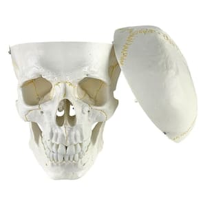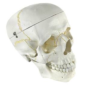 Modelo anatômico do crânio, em tamanho natural, desmontável em até 2 partes, evidencia estrutura interna, fissuras cranianas, base do crânio, arcada dentária e mandíbula articulável. Confeccionado em resina plástica rígida. Composto por: Calota craniana Arcada dentária Cavidade orbitária Frontal Temporal Vômer Nasal Palatino Etmoides Maxila Mandíbula Parietal Zigomático Lacrimal Esfenoide Occipital