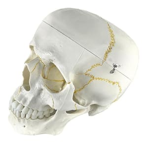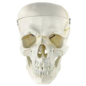 Modelo anatômico do crânio, em tamanho natural, desmontável em até 2 partes, evidencia estrutura interna, fissuras cranianas, base do crânio, arcada dentária e mandíbula articulável. Confeccionado em resina plástica rígida. Composto por: Calota craniana Arcada dentária Cavidade orbitária Frontal Temporal Vômer Nasal Palatino Etmoides Maxila Mandíbula Parietal Zigomático Lacrimal Esfenoide Occipital