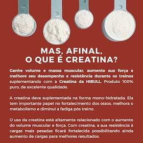 Mas, afinal, o que é creatina Ganhe volume e massa muscular, aumente sua força e melhore seu desempenho e resistência durante os treinos suplementando com a Creatina da HIBULL. Produto 100% puro, de excelente qualidade. A creatina deve suplementada na forma mono-hidratada. Ela tem importante papel no fortalecimento dos ossos, melhora o metabolismo e diminui a fadiga pós treino. O uso da creatina está altamente relacionado com o aumento do volume muscular e força. Com creatina, a sua resistência à cargas mais pesadas ficará fortalecida possibilitando ainda aumento de cargas para melhores resultados.