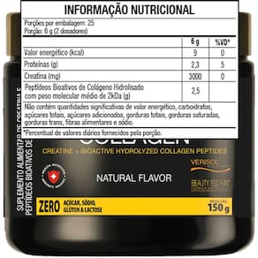Você precisa conhecer a maior novidade da belíssima: o beauty creatine collagen esse produto é a junção da creatina pura com colágeno A perfeita combinação para fornecer energia para as células musculares, obter melhora na performance cerebral e cognitiva além de auxiliar na diminuição da flacidez, atenuar rugas e linhas finas. Beauty creatine collagen está disponível em cinco sabores deliciosos, são eles: lichia, tangerina, limonada suíça, pia colada, natural flavor sem sabor . Para uma experiência incrível, você pode diluir uma dose 2 scoops 6g , em 150ml de água gelada. Desfrutando do melhor para o seu momento de autocuidado com belissima beauty care nutrition. Beauty creatine collagen é um produto zero açúcar, zero glúten e zero lactose Marca: Não Informado Ean: 7908808001546
