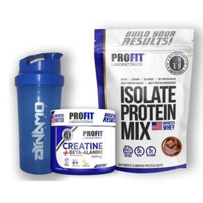 Creatina+beta Alanina 300g e Isolate Protein Mix 900g Profit Sabor: Chocolate Kit Creatina + Beta-Alanina 300g Sabor: Natural e Isolate Protein Mix 900g Profit Laboratórios + Coqueteleira 600ml Dynamo Labz
