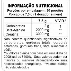 Sugestão de Uso: Creatina + Beta-Alanina: Diluir 7,5g 1 dosador e meio em 100ml de água ou bebida de sua preferência. Consumir 30ml a cada duas horas ou conforme orientação de um médico ou nutricionista.