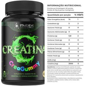Creatina monohidratada, agentes de massa maltilol e sorbirol, gelificantes gelatina e pectina, acidulantes ácido cítrico e ácido lático, aroma idêntico ao natural de uva, glaceante cera de carnaúba, triglicerídeos de cadeia média, conversador sorbato de potássio, corantes artificiais azul brilhante fcf.