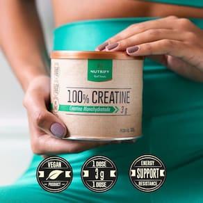 Os benefícios da suplementação de creatina são amplamente comprovados pela ciência. A creatina auxilia no aumento do desempenho físico durante exercícios repetidos de curta duração e alta intensidade. 100% CREATINE NUTRIFY é fabricada com creatina monohidratada. É Vegana, isenta de corantes, conservantes ou qualquer outro aditivo, 100% CREATINE NUTRIFY oferta 3 g de creatina na dose diária recomendada.