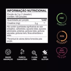 Ingredientes: Creatina Monohidratada. Recomendação de uso: Recomenda-se a ingestão de 1 um dosador de 3g. Produto indicado para adultos acima de 19 anos. Não exceder a recomendação diária de consumo na embalagem. Este produto não deve ser consumido por gestantes, lactantes e crianças. Após aberto, deve ser consumido em até 30 dias.