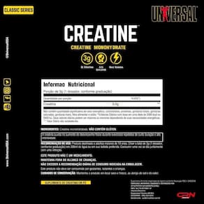 Creatina Monohidratada 200g - Universal Nutrition Creatina Universal é um suplemento alimentar à base de Creatina Monohidratada e Micronizada fabricada pela consagrada marca americana Universal Nutrition. Amplamente conhecida e mundialmente utilizada, a Creatina Universal destaca-se também pelo selo de qualidade Creapure, uma creatina de origem Alemã produzida com avançados processos tecnológicos que garantem um elevado grau de pureza e alta taxa de absorção.Anvisa: 80146501346