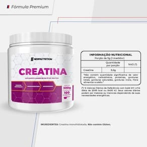 A 3X Creatina 300G Micronizada Monohidratada New Nutrition é composta apenas por creatina monohidratada, sendo livre de glúten. Além disso, é um produto dispensado de registro conforme a RDC 27/2010.