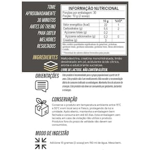 Maltodextrina, creatina monohidratada, limão desidratado em pó, acidulante ácido cítrico, aroma e edulcorante sucralose.