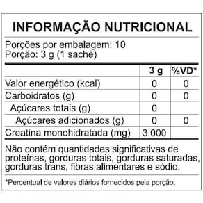 Reposição de creatina de alta pureza e absorção; Creatina monohidratada: forma mais estudada e com eficácia confirmada por décadas em estudos clínicos; Creatina micronizada: fácil dispersão em líquidos; Auxilia no aumento do desempenho físico durante exercícios repetidos de curta duração e alta intensidade;
