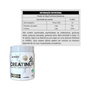 A Creatin Up é Utilizado principalmente para aumentar força muscular e desempenho. Essa creatina é 100% monohidratada. Além disso, não possui conservantes ou aditivos em sua composição, garantindo maior pureza para o suplemento. Se você procura maior potência muscular para melhorar o desempenho do seu treino, essa é uma boa pedida. Além de possuir um elevado padrão de qualidade, é também o melhor custo-benefício do mercado. Suplemento de creatina 100% monohidratada, sem conservantes e aditivos. Indicada para melhora da potência muscular em treinamentos de força e explosão. Ingredientes: Creatina monohidratada. Não contém glúten. Sem conservantes.