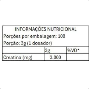 Ingredientes: Creatina monohidratada Creapure . Não contém: Adoçantes, corantes ou aromatizantes artificiais.