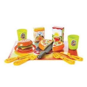 O vamos lanchar é ideal para juntar os amiguinhos e a família para brincarem todos juntos de uma forma muito divertida. O cardápio requintado acompanha 1 pão de hamburguer, 1 queijo, 1 alface, 1 carne, 1 pizza brotinho, 2 pratos, 2 copos, 2 garfos, 2 facas, 2 caixinhas cartonadas, 2 toalhas cartonadas e 1 faca grande. Uma delícia de lanche e brincadeira Contém: 18 peças. nbm9503.00.80 Faixa etária indicada: A partir dos 3 anos.