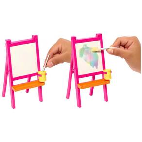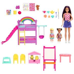 Com 3 bonecas e mais de 15 peças que incluem móveis e acessórios, há tantas histórias para contar neste playset Barbie Skipper First Jobs com tema de creche Jogue fora o tempo criativo com o cavalete de arte que muda de cor use água gelada para pintar uma imagem e água morna para retornar à tela em branco Faça um show de marionetes basta girar o botão para vê los se moverem de um lado para o outro Faça uma festa do chá na mesa e nas cadeiras, há um bule, xícaras e muito mais para a hora do lanche Desfrute do recreio com um baloiço e escorrega, depois deite se para tirar uma soneca com os beliches, cobertores e ursinhos. Cheio de diversão, o playset da creche Skipper é um ótimo presente para crianças de 3 anos ou mais, especialmente aquelas que adoram cuidar e criar histórias