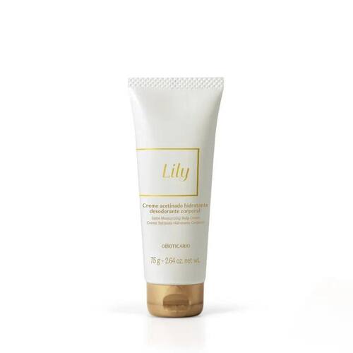 Creme Acetinado Hidratante Desodorante Corporal Lily 75g O Creme Acetinado Hidratante Desodorante Corporal Lily entrega sua fragrância preferida em um tamanho prático para levar em todas as ocasiões. O creme acetinado é a combinação ideal de perfumação intensa e prolongada com a sofisticada fragrância de Lily, que é da família olfativa Floral Bouquet. Sua textura aveludada e macia desliza facilmente na pele garantindo: