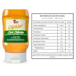 Os creme cheddar são produtos únicos e totalmente inovadores no mercado, para do queijo comum e , eles possuem todo o sabor do queijo, com zero calorias, zero gorduras e com um teor de sódio abaixo de um queijo comum. Creme cheddar Ingredientes: água, polidextrose, queijo cheddar, amido de batata modificado, sal rosa do himalaia, fibra de milho, lactase, espessante goma guar, acidulante ácido lático, conservadores sorbato de potássio e benzoato de sódio, aromatizante e edulcorante natural stevia. Queijo cheddar fornece quantidades não significativas de gorduras . Não contém glúten. Não contém lactose.