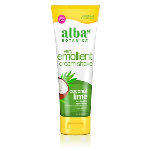 - Um tubo de 8 onças de creme de barbear de limão e coco muito emoliente da Alba Botanica