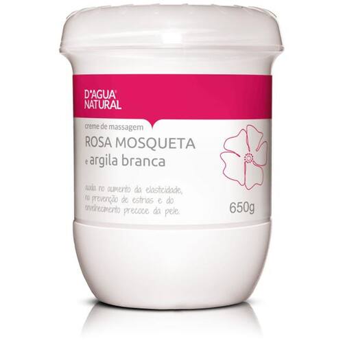 Este Creme de Massagem Rosa Mosqueta e Argila Branca Dágua Natural combina o óleo de Rosa Mosqueta com Argila Branca. O óleo de Rosa Mosqueta é rico em ácidos graxos insaturados, auxilia na prevenção de estrias e do envelhecimento precoce da pele. Já a Argila Branca auxilia no aumento da elasticidade da pele e forma uma película protetora da poluição e desidratação diária. Possui suave fragrância e é livre de parabenos.