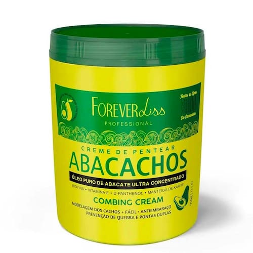 O Creme de Pentear cabelos Cacheados Abacachos Forever Liss 950g ativa suavemente os cachos, deixando eles definidos e delicados. Sua formulação facilita o penteado no cabelo a seco, proporcionando desembaraço e maciez. Com ação defrizante, combate o arrepiado, para que o cabelo fique com os cachos formosos. Agora as cacheadas vão ganhar curvas perfeitas e um brilho espetacular! Esta nova linha realça todos os tipos de cabelos ondulados e cacheados, inclusive o tipo 5. Aqui tem uma mistura natural, rica em ÓLEO DE ABACATE, Biotina, Vitamina E, D-Panthenol e Manteiga de Karitê.