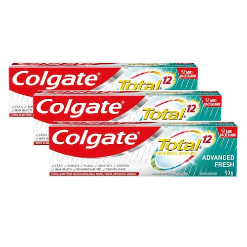 CREME DENTAL COLGATE TOTAL 12 ADVANCED FRESH Proporciona proteção completa para uma boca mais saudável. Seu sistema antibacteriano age por 12 horas reduzindo continuamente a placa bacteriana. Ajuda a combater os germes proporcionando hálito fresco duradouro. Instruções de uso: Escove seus dentes adequadamente após cada refeição, três vezes ao dia ou segundo a recomendação de seu dentista. Enxágue completamente depois da escovação. Precauções: Crianças menores de 6 anos devem usar uma quantidade do tamanho de uma gota com supervisão de um adulto para minimizar a deglutição. Se estiver ingerindo flúor proveniente de outras fontes, consulte seu médico ou dentista. Ingredientes: Fluoruro de Sodio 0,32% (1450 ppm de Flúor), Triclosano 0,3%. Aqua/Agua, Sorbitol, Hydrated Silica/Sílica Hidratada, PVM/MA Copolymer/Copolímero PVM/MA, Sodium Lauryl Sulfate/Laurilsulfato de Sodio, Aroma/ Sabor, Carragenina. Ean: 7891024135310