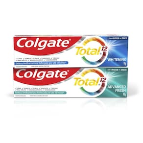 Total 12 Advanced Fresh: aproveite uma saúde bucal completa para você e sua família com a pasta de dentes Colgate Total 12 Advanced Fresh com o poder do Zinco, que deixa um hálito fresco duradouro (com escovação regular). Total 12 Whitening: a pasta de dentes com Zinco Colgate Total 12 Whitening é ideal para uma saúde bucal completa, fornecendo até 12 horas de defesa ativa contra bactérias (até 12 horas de proteção contra bactérias e mau hálito, com uso contínuo por 4 semanas), enquanto ajuda a remover manchas dos dentes.