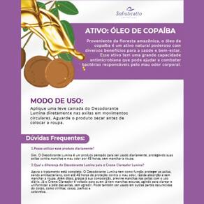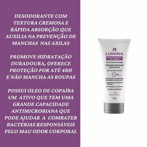 Creme Desodorante Antimancha Escura Na Axila 48h De Proteção Desodorante Antimanchas Proteção e Cuidado para Sua Pele Você está cansado de manchas nas axilas causadas pelo desodorante Experimente agora o Desodorante em Creme Antimanchas Lumina, desenvolvido para proteger sua pele e suas roupas O Desodorante Antimanchas Antitranspirante Lumina que proporciona proteção por até 48 horas, atua como um tratamento para evitar manchas nas axilas. Lumina Desodorante é formulado com Óleo de Copaíba proveniente da floresta amazônica que é um ativo natural poderoso com diversos benefícios para a saúde e bem-estar. Esse ativo tem uma grande capacidade antimicrobiana que pode ajudar contra as bactérias responsáveis pelo mau odor corporal. Oferecendo uma proteção eficaz sem comprometer suas roupas favoritas. O Desodorante Antitranspirante Lumina redefine a experiência de cuidados pessoais, oferecendo uma solução completa para o seu dia a dia. DERMATOLOGICAMENTE TESTADO Benefícios do Desodorante Antimanchas: Antitranspirante Proteção 48 horas Contra manchas nas axilas Combate manchas em roupas Rápida absorção Fórmula testada dermatologicamente ATENÇÃO O Desodorante Lumina ajuda a evitar manchas nas axilas e NÂO possui ação clareadora. Caso você já tenha manchas nas axilas, precisa utilizá-lo em conjunto com o Clareador Corporal com Rosa Mosqueta Lumina ou algum de sua preferência. ANVISA PROCESSO: 25351.227969/2024-52 Modo de usar: Aplique uma leve camada do Desodorante Lumina diretamente nas axilas em movimentos circulares. Aguarde o produto secar antes de colocar a roupa. Dúvidas Frequentes: 1.Posso utilizar esse produto diariamente Sim. O Desodorante Lumina é um produto pensado para ser diariamente, protegendo suas axilas contra manchas e mau odor por 48 horas, sem manchar a roupa. 2.Qual a diferença do Desodorante Lumina para o Creme Clareador Lumina Agora o tratamento está completo. O Desodorante Lumina tem como função proteger as axilas, sendo antibacteriano, com até 48 horas de proteção contra o mau odor, rápida absorção e sem manchar a roupa. Além disso, graças à sua composição, previne manchas nas axilas com o uso diário. Já o Creme Clareador é voltado para quem já tem manchas escuras, agindo para clarear e uniformizar a pele das axilas, sem agredir. Pode também ser em outras partes escurecidas do corpo, como virilhas, coxas, joelhos e cotovelos -------------------------------------- Tags de Pesquisa: Desodorante antimanchas, manchas nas axilas, proteção contra manchas, desodorante que não mancha roupas, evitar manchas nas roupas, melhor desodorante anti manchas, desodorante para desmanchar axilas, axila escura, axilas escuras o que fazer, axila escura o que pode ser, mancha escura axila