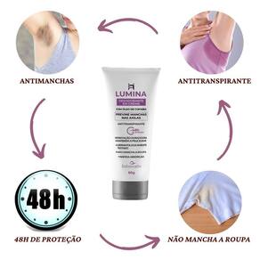 Creme Desodorante Antimancha Roupas E Axilas 48h De Proteção Desodorante Antimanchas Proteção e Cuidado para Sua Pele Você está cansado de manchas nas axilas causadas pelo desodorante Experimente agora o Desodorante em Creme Antimanchas Lumina, desenvolvido para proteger sua pele e suas roupas O Desodorante Antimanchas Antitranspirante Lumina que proporciona proteção por até 48 horas, atua como um tratamento para evitar manchas nas axilas. Lumina Desodorante é formulado com Óleo de Copaíba proveniente da floresta amazônica que é um ativo natural poderoso com diversos benefícios para a saúde e bem-estar. Esse ativo tem uma grande capacidade antimicrobiana que pode ajudar contra as bactérias responsáveis pelo mau odor corporal. Oferecendo uma proteção eficaz sem comprometer suas roupas favoritas. O Desodorante Antitranspirante Lumina redefine a experiência de cuidados pessoais, oferecendo uma solução completa para o seu dia a dia. DERMATOLOGICAMENTE TESTADO Benefícios do Desodorante Antimanchas: Antitranspirante Proteção 48 horas Contra manchas nas axilas Combate manchas em roupas Rápida absorção Fórmula testada dermatologicamente ATENÇÃO O Desodorante Lumina ajuda a evitar manchas nas axilas e NÂO possui ação clareadora. Caso você já tenha manchas nas axilas, precisa utilizá-lo em conjunto com o Clareador Corporal com Rosa Mosqueta Lumina ou algum de sua preferência. ANVISA PROCESSO: 25351.227969/2024-52 Modo de usar: Aplique uma leve camada do Desodorante Lumina diretamente nas axilas em movimentos circulares. Aguarde o produto secar antes de colocar a roupa. Dúvidas Frequentes: 1.Posso utilizar esse produto diariamente Sim. O Desodorante Lumina é um produto pensado para ser diariamente, protegendo suas axilas contra manchas e mau odor por 48 horas, sem manchar a roupa. 2.Qual a diferença do Desodorante Lumina para o Creme Clareador Lumina Agora o tratamento está completo. O Desodorante Lumina tem como função proteger as axilas, sendo antibacteriano, com até 48 horas de proteção contra o mau odor, rápida absorção e sem manchar a roupa. Além disso, graças à sua composição, previne manchas nas axilas com o uso diário. Já o Creme Clareador é voltado para quem já tem manchas escuras, agindo para clarear e uniformizar a pele das axilas, sem agredir. Pode também ser em outras partes escurecidas do corpo, como virilhas, coxas, joelhos e cotovelos -------------------------------------- Tags de Pesquisa: Desodorante antimanchas, manchas nas axilas, proteção contra manchas, desodorante que não mancha roupas, evitar manchas nas roupas, melhor desodorante anti manchas, desodorante para desmanchar axilas, axila escura, axilas escuras o que fazer, axila escura o que pode ser, mancha escura axila