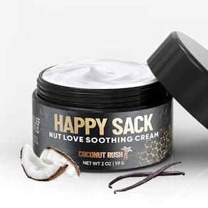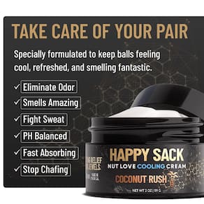 - Formulado com ingredientes comprovados. O creme refrescante Happy Sack Nut Love "Coconut Rush" é embalado com ingredientes que adoram bolas, como pepino, manteiga de karité e Avena Sativa para ajudar a promover bolas masculinas sem odor e cheiro. Além disso, aloe vera, pepino e camomila ajudam a evitar fricção na pele e coceira na bola.