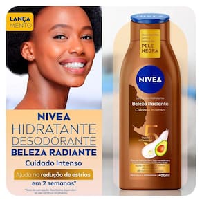 O Creme Hidratante Corporal Nivea Beleza Radiante Cuidado Intenso promove 48 horas de hidratação profunda e foi especialmente desenvolvido para a beleza da pele negra. Auxilia na reparação das áreas ressecadas aliviando a descamação da pele causada pelo ressecamento, realça o brilho natural e uniformiza o tom pele e reduz a aparência de marcas escurecidas. Possui fórmula enriquecida com 5 óleos naturais, abacate, oliva, soja, macadâmia e amêndoas, além de vitaminas E,B3 e Pro Vit B5.