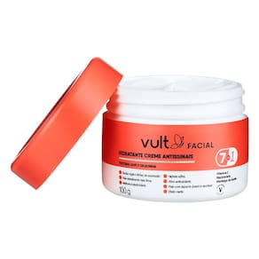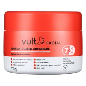 Creme Hidratante Facial Vult Antissinais 100g O hidratante creme antissinais 7 em 1 de Vult facial oferece 48hrs de hidratação e conta com Vitamina E, poderoso ativo antioxidante, Niacinamida e Mantei