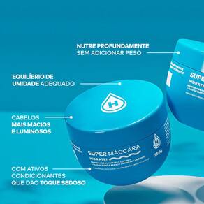 O Creme Hidratante Hidratei Super Máscara 250g proporciona hidratação profunda, protege a queratina da fibra capilar, auxiliando no fortalecimento dos cabelos, prevenindo o frizz e pontas duplas, revitalização, brilho e maciez de cabelos. A Máscara Hidratei foi formulada para hidratar e nutrir profundamente os fios de maneira prática e eficaz. Especialmente desenvolvida com ácido hialurônico, óleo de buriti, manteigas de murumuru e cupuaçu.