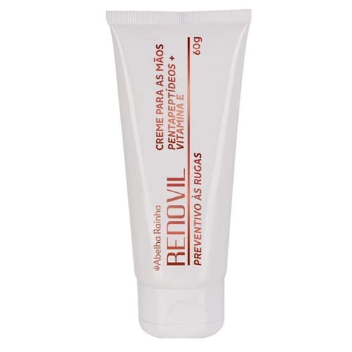 O Abelha Rainha Renovil Creme para Mãos Pentapeptídeos + Vitamina E Preventivo às Rugas 60g é um creme desenvolvido para oferecer cuidados específicos às mãos, prevenindo o envelhecimento precoce e as rugas. Sua fórmula avançada combina pentapeptídeos, um ativo conhecido por estimular a produção de colágeno, e vitamina E, um potente antioxidante que ajuda a combater os sinais de envelhecimento e a manter a pele das mãos hidratada e rejuvenescida. Principais características: Pentapeptídeos: Os pentapeptídeos ajudam a estimular a produção de colágeno na pele, promovendo firmeza e elasticidade, além de prevenir o surgimento de rugas e linhas finas nas mãos. Vitamina E: Conhecida por suas propriedades antioxidantes, a vitamina E ajuda a proteger a pele contra os danos causados pelos radicais livres, prevenindo o envelhecimento precoce e mantendo as mãos mais jovens e saudáveis. Hidratação intensa: A fórmula do creme oferece uma hidratação profunda, mantendo a pele das mãos macia, suave e bem cuidada ao longo do dia. Ação preventiva contra rugas: A combinação de ingredientes ajuda a prevenir o aparecimento de rugas e a melhorar a textura da pele das mãos, proporcionando um efeito de rejuvenescimento visível. Absorção rápida e não oleosa: O creme possui uma textura de fácil absorção, que não deixa a pele oleosa ou pegajosa, permitindo o uso diário sem desconforto. Embalagem prática de 60g: A embalagem é compacta e ideal para o uso diário, podendo ser facilmente transportada na bolsa ou necessaire. Este creme para mãos é a escolha ideal para quem deseja manter as mãos hidratadas, protegidas e livres de rugas, com ação regeneradora e preventiva, promovendo o cuidado contínuo com a pele. Marca: Não Informado