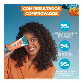 Nossa fórmula, com efeito Anti-Travesseiro, enriquecida com Ácido Hialurônico e Óleo de Rícino, nutre profundamente os fios e funciona como um “amortecedor” para proteger e manter a definição dos cachos durante a noite. Você acorda na manhã seguinte com os cachos dos seus sonhos: nutridos, definidos e com o frizz controlado.