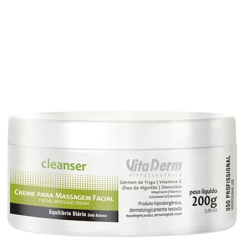 Creme de Massagem Facial Um produto hipoalérgico, emoliente que proporciona deslizamento intenso das mãos durante a Massagem. Tem sua fórmula enriquecida com Gérmen de trigo, vitamina E, óleo de algodão de densiskin que promovem ação hidratante e suavizante. Possui ação antioxidante e hidratante, auxilia na regeneração e nutrição da pele. Principais ativos: Gérmen de trigo, Vitamina E, Oléo de amêndoas doce e densiskin. Modo de Uso: Aplicar sobre a superfície antes das manobras de massagem. Rendimento: 80 aplicações