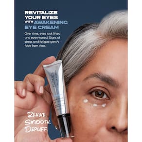 - OLHOS RADIANTES: obtenha uma área sob os olhos visivelmente radiante e uniforme com nosso Creme de Olhos Awakening. Ele contém ingredientes poderosos que combatem a descoloração e as manchas da idade, diminuem eficazmente as olheiras e promovem um tom de pele mais uniforme. Experimente uma sensação de confiança à medida que seus olhos parecem mais vibrantes e descansados.
