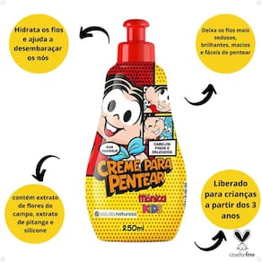 O Creme para Pentear Cabelos Finos e Delicados Mônica Kids contém extrato de flores do campo, extrato de pitanga e silicone, que deixam os fios mais sedosos, brilhantes, macios e fáceis de pentear.O creme hidrata os fios e ajuda a desembaraçar os nós, além de deixar o cabelo com um delicioso cheirinho. Não irrita os olhos. Liberado para crianças a partir de 03 anos.