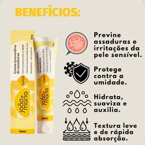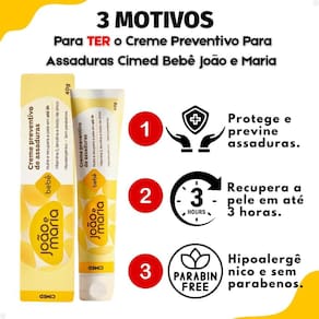Creme Preventivo Para Assaduras Cimed Bebê João e Maria 40g O Creme Preventivo Para Assaduras Cimed Bebê João e Maria 40g foi desenvolvido especialmente para proteger a pele delicada do bebê contra irritações e assaduras. Com fórmula suave e segura, cria uma barreira protetora que isola a umidade e reduz o atrito causado pelas fraldas, prevenindo o desconforto. Enriquecido com ingredientes calmantes e hidratantes, mantém a pele do bebê macia, saudável e protegida em todas as trocas de fralda.
