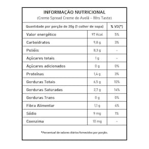 Descrição: Os novos cremes da mrs taste estão prestes a chegar para revolucionar o seu paladar Sua formulação conta com whey protein, coenzima q10 e zero adição de açúcar. Esses spreads são a combinação perfeita de sabor e saúde. Prepare-se para se deliciar com essas novidades que vão transformar suas receitas e momentos de lanche. Ingredientes: Maltitol, gordura vegetal, cacau em pó, leite desnatado em pó, proteína concentrada do soro de leite, coenzima q10, aromatizantes, emulsificantes lecitina de soja e polirricinoleato de poliglicerol e edulcorante stevia. Não contém glúten. Alérgicos: contém derivados de leite e soja. Pode conter avelã, amendoim e pistache. Sugestão de consumo: Consumir uma porção 20g ao dia, ou conforme orientação . Conservação: Conservar este produto em local seco e fresco. Em altas temperaturas pode haver a presença natural de oleosidade na superfície - misture bem para voltar à cremosidade ideal.