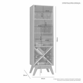 A sala de jantar é um lugar de confraternização, por isso móveis de qualidade e beleza são essenciais na hora de decorá-la. Cristaleira Graça possui Porta em vidro temperado, Adega decorativa e Pés em madeira maciça. Móvel tem um design leve e moderno ideal para qualquer cômodo da casa. Acabamento da Gaveta: Acabamento da Porta: Cristal Acabamento da Prateleira: Pintura UV Acabamento dos Pés: Acompanha Lâmpada: Altura do Espelho: Altura do Espelho 01: Altura do Espelho 02: Altura do Espelho 03: Altura do Espelho 04: Altura do Espelho 05: Altura do Espelho 06: Altura dos Pés: 20 Ambiente Principal: Sala de Jantar Complexidade da Montagem: Baixa: pode ser montado por uma pessoa sozinha Cor: Cinamomo/Off White Cor do Produto: Cinamomo/Off White Cor Flex: Cor Interna: Escala de Brilho: Fosco Escala de Brilho da Gaveta: Escala de Brilho da Porta: Brilhante Escala de Brilho da Prateleira: Fosco Espessura do Espelho: Espessura do Vidro: 4 Fita Integrada: Formato do Espelho: Gaveta com Chave: Informações Complementares: Itens Inclusos: 1 Cristaleira, Kit Ferragens e Manual de Montagem Largura do Espelho: Largura do Espelho 01: Largura do Espelho 02: Largura do Espelho 03: Largura do Espelho 04: Largura do Espelho 05: Largura do Espelho 06: Linha ou Coleção: Manual de Especificação Técnica: Manual de Montagem e Instalação: https://cdn2.madeiramadeira.com.br/atributo/jcm-moveis/1193032-cristaleira-graca-ref-7400-jcm-passo-a-passo-f4.pdf Material da Gaveta: Material da Porta: Vidro Material da Prateleira: MDP Material do Puxador da Gaveta: Material do Puxador da Porta: ABS Material dos Pés: Material Principal: MDP Montagem Flex: Necessita Montagem: Sim Origem do Produto: Nacional Pés Reguláveis: Peso: 28.65 Peso Máximo por Gaveta: Peso Máximo por Prateleira: 5 Possui Adega: Sim Possui Espelho: Não Possui Gavetas: Não Possui iluminação: Não Possui Nicho: Não Possui Pés: 04 Possui Portas: 01 Possui Prateleiras: 02 Possui Rodízio: Não Possui Vidro: Sim Quantidade de Espelho: Quantidade de Garrafas da Adega: 9 Recomendações de Uso, Manutenção e Limpeza: Pano levemente úmido Rodízio com Trava: Sapatas Niveladoras: Não Sistema de Montagem: Parafusos e Minifix Suporta Até (kg): 35 Tipo de Corrediça da Gaveta: Tipo de Dobradiça/Corrediça da Porta: Metálica Tipo de Fixação do Espelho: Tipo de Madeira Maciça: Tipo de Madeira Maciça da Gaveta: Tipo de Madeira Maciça da Porta: Tipo de Madeira Maciça da Prateleira: Tipo de Madeira Maciça do Puxador da Gaveta: Tipo de Madeira Maciça do Puxador da Porta: Tipo de Madeira Maciça dos Pés: Tipo de Porta: Bater Tipo de Puxador da Gaveta: Tipo de Puxador da Porta: Externo