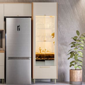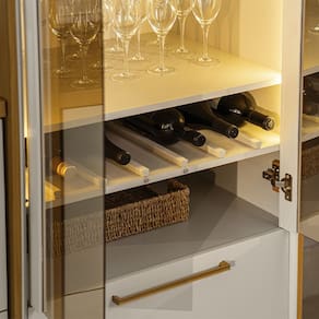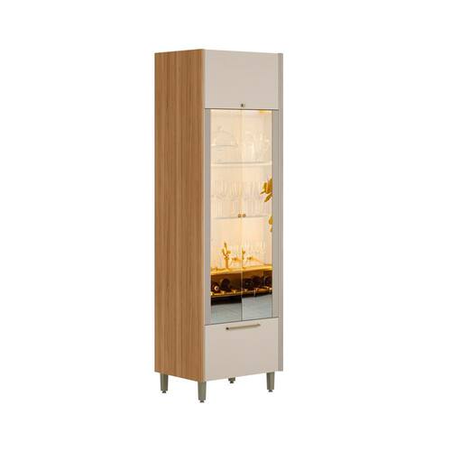 Com design sofisticado, a Cristaleira Atena conta com portas de vidro reflecta, porta basculante com pistão a gás, gaveta com corrediça telescópica, garrafeiro, LED embutido e puxadores em alumínio. Funcionalidade e elegância para seu ambiente.
