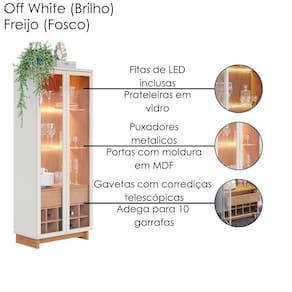 Cristaleira Guanabara, design moderno e minimalista para transformar sua sala de jantar. Estrutura em MDP/MDF (25 e 15 mm) e acabamento em pintura UV texturizada. Possui portas em vidro (5 mm) com molduras em MDF, gaveta com corrediças telescópicas, puxadores em alumínio (dourado), prateleiras internas em vidro (5 mm) com fitas LED e adega para 10 garrafas. Este produto será entregue em 3 volumes.