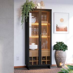 Cristaleira Guanabara, design moderno e minimalista para transformar sua sala de jantar. Estrutura em MDP/MDF (25 e 15 mm) e acabamento em pintura UV texturizada. Possui portas em vidro (5 mm) com molduras em MDF, gaveta com corrediças telescópicas, puxadores em alumínio (dourado), prateleiras internas em vidro (5 mm) com fitas LED e adega para 10 garrafas. Este produto será entregue em 3 volumes.