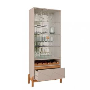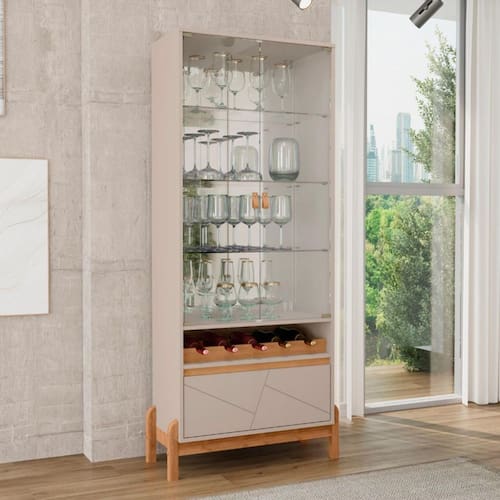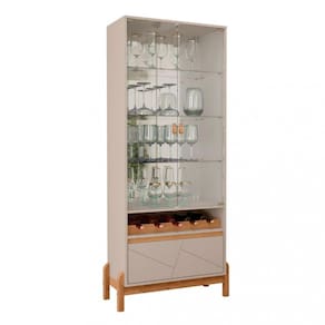 Características: Tampo e laterais em MDP de 15mm Frente de Gaveta de MDF usinada 2 Porta de vidro temperado de 4mm 3 Prateleiras de vidro temperado de 4mm 1 Gaveta Corrediças telescópicas 4 Pés de madeira maciça Puxador de alça em material ecológico Contém adega para 5 garrafas