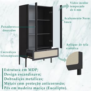 Cristaleira 2 Portas de Vidro 1 Gaveta e Pés em Madeira 27963, clássica, minimalista e funcional, o móvel que irá decorar seu ambiente com elegância e requinte na medida. Estrutura e prateleiras em MDP de 15mm, costas em HDF de 3mm e vidro de 4mm, conta com acabamento BP, gaveta de corrediças telescópicas e aplique de tela sintética, dando ao produto um traço clássico e artesanal. Possui também 02 portas de vidro temperado incolor e dobradiças metálicas. Tanto a gaveta quanto as portas, possuem puxadores de poliestireno na cor dourada, seus pés são de madeira maciça (eucalipto) com acabamento PU e sapatas emborrachadas. O peso suportado por cada prateleira e pela gaveta é respectivamente: 5kg e 3kg, peso máximo suportado: 18kg. Com seus traços suaves e acolhedores, ela irá conferir design e luxo ao seu ambiente. Este móvel chegará na sua casa separado em 02 volumes.