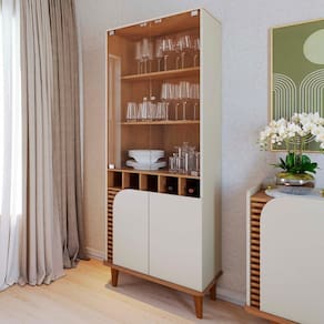 Cristaleira Jurerê une elegância e funcionalidade para valorizar sua sala de jantar! Estrutura em MDF/MDP (15 e 12 mm) com pintura UV. Composta por portas superiores em vidro (5mm), inferiores em MDF (sendo uma usinada com borda curva) além da lateral com detalhe ripado (baixo relevo). Conta com prateleiras internas, adega para 5 garrafas, puxadores em plástico e pés em madeira maciça. Este produto será entregue em 2 volumes.