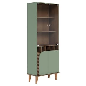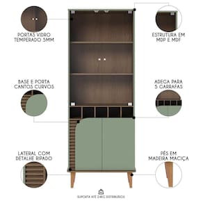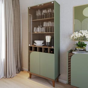 Elaborada com materiais de qualidade e design que combina os estilos retrô e contemporâneo, essa cristaleira moderna conta com detalhes marcantes: a começar pelos pés de madeira maciça, que garante estabilidade; linhas orgânicas expressas pelos cantos curvos; duas portas de vidro que revelam a parte interna como as louças e taças e, ainda, uma adega para até cinco garrafas. Além disso, a parte inferior completa a funcionalidade com um amplo espaço interno, ideal para organizar os mais diversos itens.