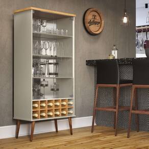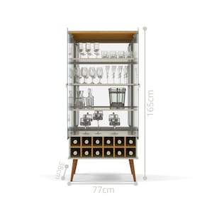 Feito em MDF. Contém 4 prateleiras, adega com 12 nichos para acomodar garrafas, 2 portas de vidro temperado 4mm e espelhos internos.