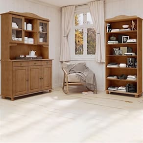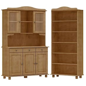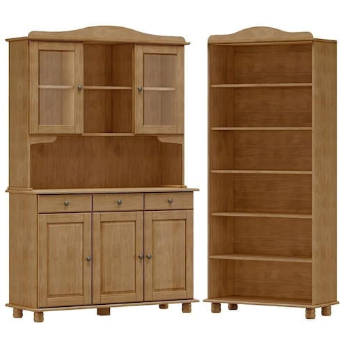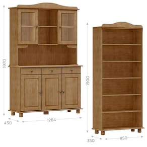 Cristaleira e Estante Livreiro, um conjunto projetado para quem busca móveis que combinam elegância e funcionalidade para complementar sua decoração. Produzido em madeira maciça de pinus de reflorestamento, sua estrutura robusta garante durabilidade e resistência. A Cristaleira de 128,4cm de largura, conta com 05 portas sendo 02 de vidro incolor, que possuem dobradiças com amortecimento. As gavetas com corrediças telescópicas proporcionam abertura suave e máxima praticidade para guardar itens menores, enquanto os puxadores metálicos adicionam um toque moderno ao design clássico do produto. Com amplo espaço para organização, a Estante de 85cm de largura é perfeita para acomodar livros, objetos decorativos ou itens de sua preferência. Ambos os móveis possuem pintura acetinada com verniz PU e UV, que realça a beleza natural da madeira enquanto protege contra desgastes do dia a dia, e pés torneados em madeira maciça que garantem estabilidade e charme artesanal. Estes móveis chegarão em sua casa separados em 03 volumes.